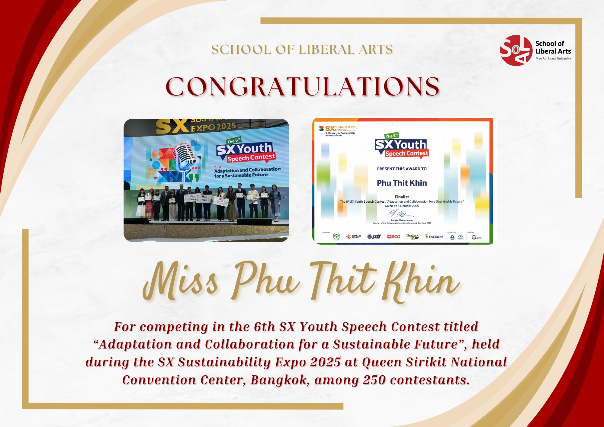 On 5 October 2025, Miss Phu Thit Khin, a third-year student from the Thai Language and Culture for Foreigners Program, School of Liberal Arts, Mae Fah Luang University, participated in the 6th SX Youth Speech Contest under the theme “Adaptation and Collaboration for a Sustainable Future.” The contest was part of the SX Sustainability Expo 2025, Thailand’s largest event promoting the United Nations Sustainable Development Goals (SDGs), held at the Queen Sirikit National Convention Center, Bangkok.
